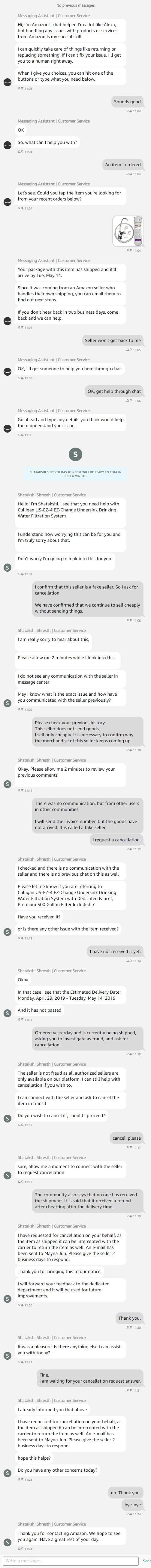 오후 11:04 Messaging Assistant | Customer Service Your package with this item has shipped and it'll arrive by Tue, May 14. Since it was coming from an Amazon seller who handles their own shipping, you can email them to find out next steps. If you don’t hear back in two business days, come back and we can help. 오후 11:04 Seller won't get back to me 오후 11:05 Messaging Assistant | Customer Service OK, I'll get someone to help you here through chat. 오후 11:05 OK, get help through chat 오후 11:06 Messaging Assistant | Customer Service Go ahead and type any details you think would help them understand your issue. 오후 11:06 S SHATAKSHI SHRESTH HAS JOINED & WILL BE READY TO CHAT IN JUST A MINUTE. Shatakshi Shresth | Customer Service Hello! I'm Shatakshi. I see that you need help with Culligan US-EZ-4 EZ-Change Undersink Drinking Water Filtration System I understand how worrying this can be for you and I'm truly sorry about that. Don't worry I'm going to look into this for you. S 오후 11:07 I confirm that this seller is a fake seller. So I ask for cancellation. We have confirmed that we continue to sell cheaply without sending things. 오후 11:08 Shatakshi Shresth | Customer Service I am really sorry to hear about this, Please allow me 2 minutes while I look into this. I do not see any communication with the seller in message center May I know what is the exact issue and how have you communicated with the seller previously? S 오후 11:09 Please check your previous history. This seller does not send goods, I sell only cheaply. It is necessary to confirm why the merchandise of this seller keeps coming up. 오후 11:10 Shatakshi Shresth | Customer Service Okay, Please allow me 2 minutes to review your previous comments S 오후 11:11 There was no communication, but from other users in other communities. I will send the invoice number, but the goods have not arrived. It is called a fake seller. I request a cancellation. 오후 11:12 Shatakshi Shresth | Customer Service I checked and there is no communication with the seller and there is no previous chat on this as well Please let me know if you are referring to Culligan US-EZ-4 EZ-Change Undersink Drinking Water Filtration System with Dedicated Faucet, Premium 500 Gallon Filter Included ? Have you received it? or is there any other issue with the item received? S 오후 11:13 I have not received it yet. 오후 11:14 Shatakshi Shresth | Customer Service Okay In that case I see that the Estimated Delivery Date: Monday, April 29, 2019 - Tuesday, May 14, 2019 And it has not passed S 오후 11:14 Ordered yesterday and is currently being shipped, asking you to investigate as fraud, and ask for cancellation. 오후 11:15 Shatakshi Shresth | Customer Service The seller is not fraud as all authorized sellers are only available on our platform, I can still help with cancellation if you wish to. I can connect with the seller and ask to cancel the item in transit Do you wish to cancel it , should I proceed? S 오후 11:17 cancel, please 오후 11:17 Shatakshi Shresth | Customer Service sure, allow me a moment to connect with the seller to request cancellation S 오후 11:17 The community also says that no one has received the shipment. It is said that it received a refund after cheatting after the delivery time. 오후 11:19 Shatakshi Shresth | Customer Service I have requested for cancellation on your behalf, as the item as shipped it can be intercepted with the carrier to return the item as well. An e-mail has been sent to Mayna Jun. Please give the seller 2 business days to respond. Thank you for bringing this to our notice. I will forward your feedback to the dedicated department and it will be used for future improvements. S 오후 11:20 Thank you. 오후 11:20 Shatakshi Shresth | Customer Service It was a pleasure. Is there anything else I can assist you with today? S 오후 11:21 Fine. I am waiting for your cancellation request answer. 오후 11:21 Shatakshi Shresth | Customer Service I already informed you that above I have requested for cancellation on your behalf, as the item as shipped it can be intercepted with the carrier to return the item as well. An e-mail has been sent to Mayna Jun. Please give the seller 2 business days to respond. hope this helps? Do you have any other concerns today? S 오후 11:23 no. Thank you. bye-bye 오후 11:24 Shatakshi Shresth | Customer Service Thank you for contacting Amazon. We hope to see you again. Have a great rest of your day. |