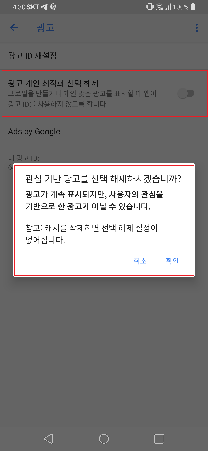 "관심 기반 광고를 선택 해제하시겠습니까?"