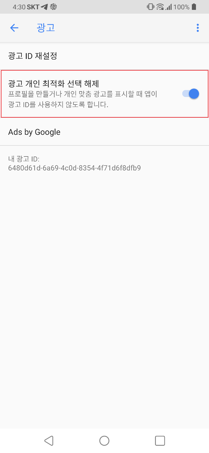 이후 "광고 개인 최적화 선택 해재" 클릭 하여 활성화를 해 주면 된다.
