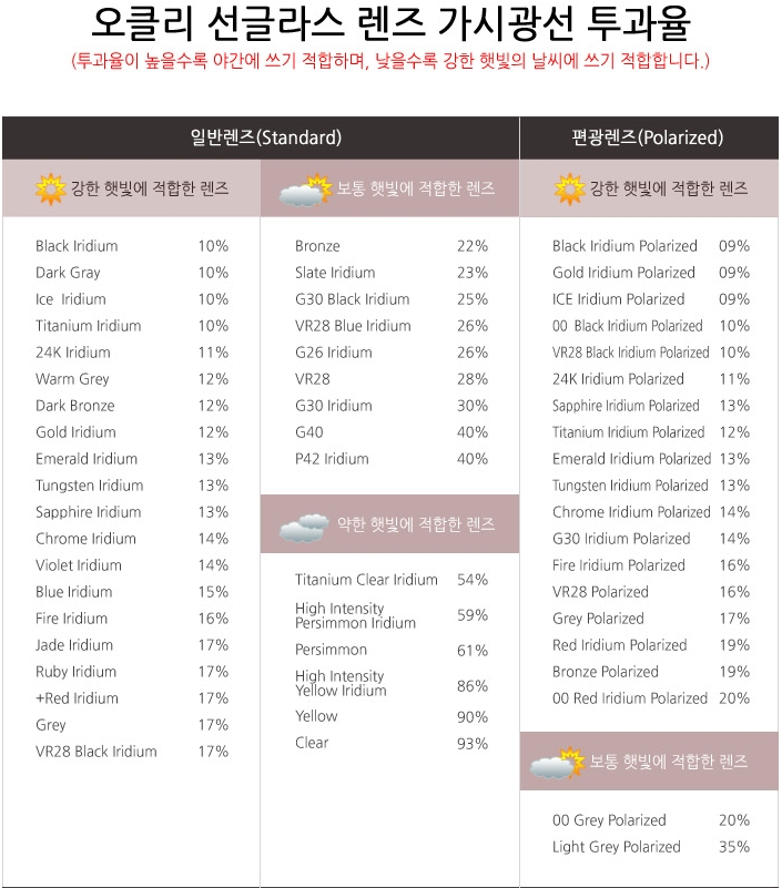 - 일반렌즈, 편광렌즈, 변색렌즈, 프리즘렌즈, 그라디언트렌즈로 구성