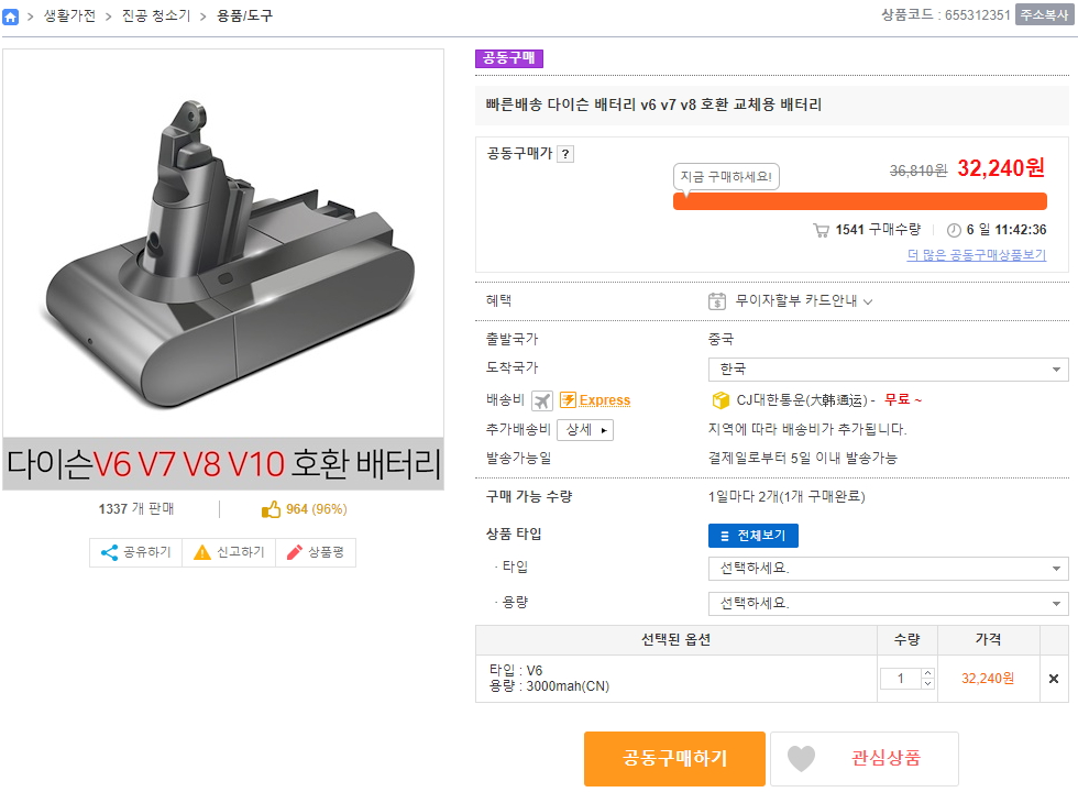 V6 배터리로 용량은 3000mah(CN)으로 구매하였다.