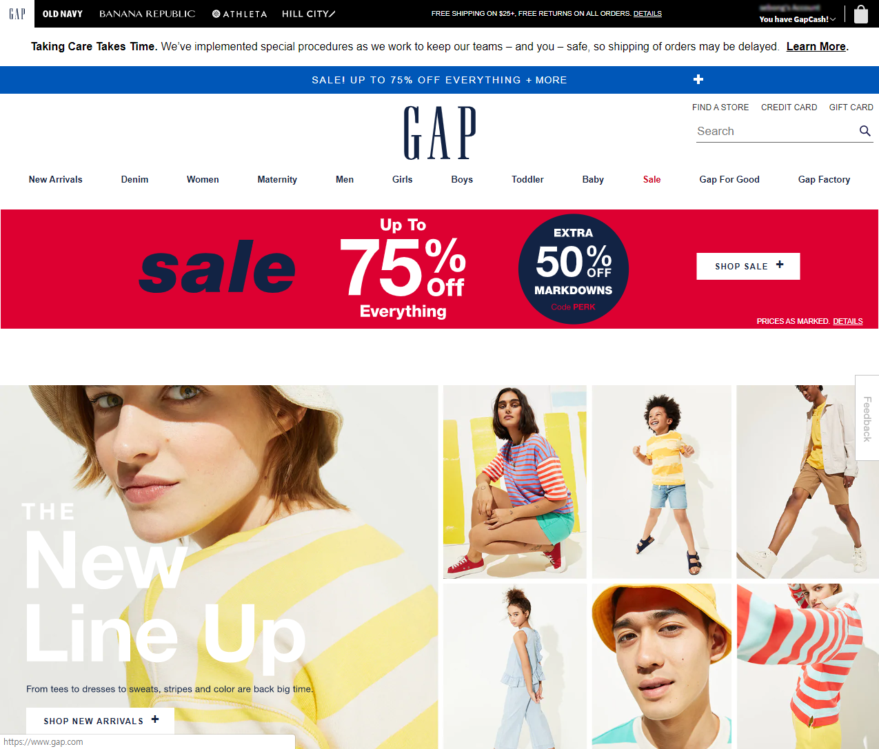 우선 GAP 사이트에 들어간다. 오늘 날짜로 들어가보니 75% 세일에 50% 추가 세일 제품들이 있네요.