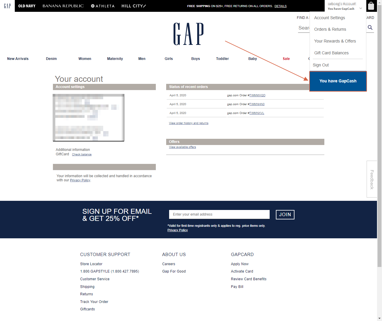 저는 GAP $80, 올드네이비 $30 이 있습니다. 아래로 더 내리면 실제 사용가능 금액 및 쿠폰을 알려줍니다.