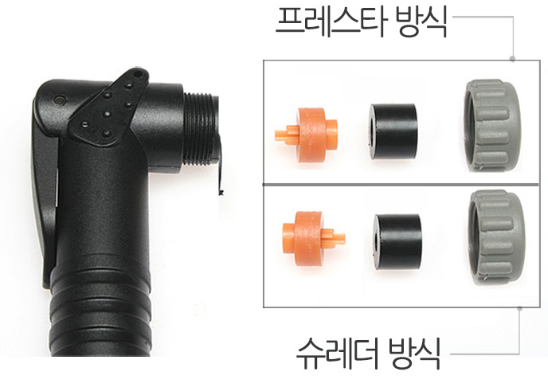 슈레더 방식은 프레스타와 동일하다. 대량의 공기를 펌핑하는데에는 프레스타 방식보다 유리하지만 바람이 프레스타 방식에 비해 잘 빠지는 편이다. 물론 던롭보다는 덜 빠진다.