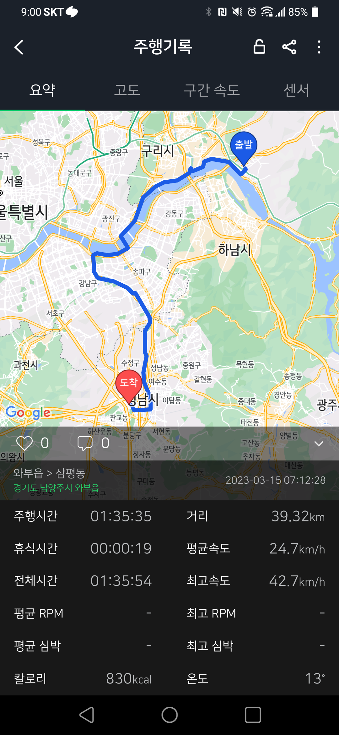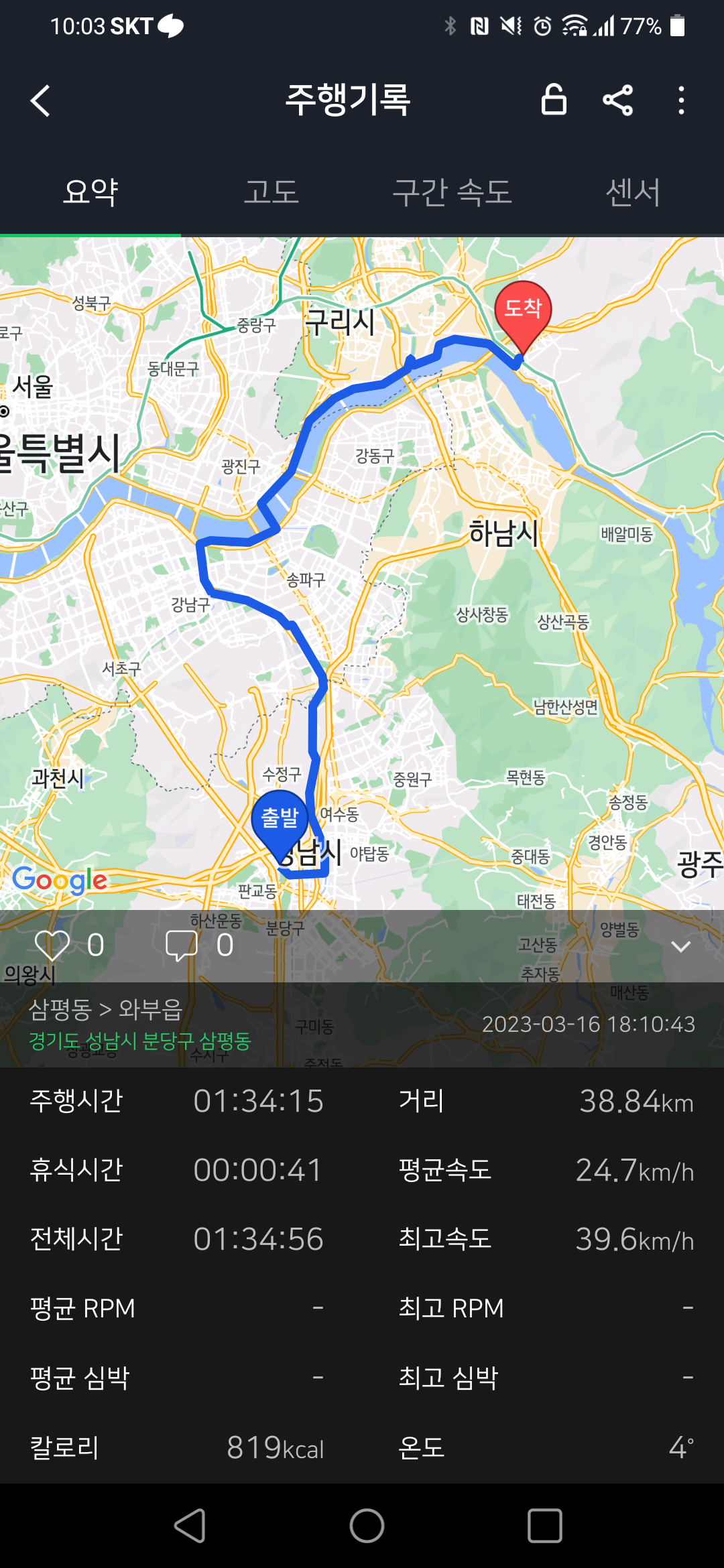 집 - 회사까지 매일 출퇴근 - 편도 대략 39km 로 하루에 약 80km 정도 타고 있네요.