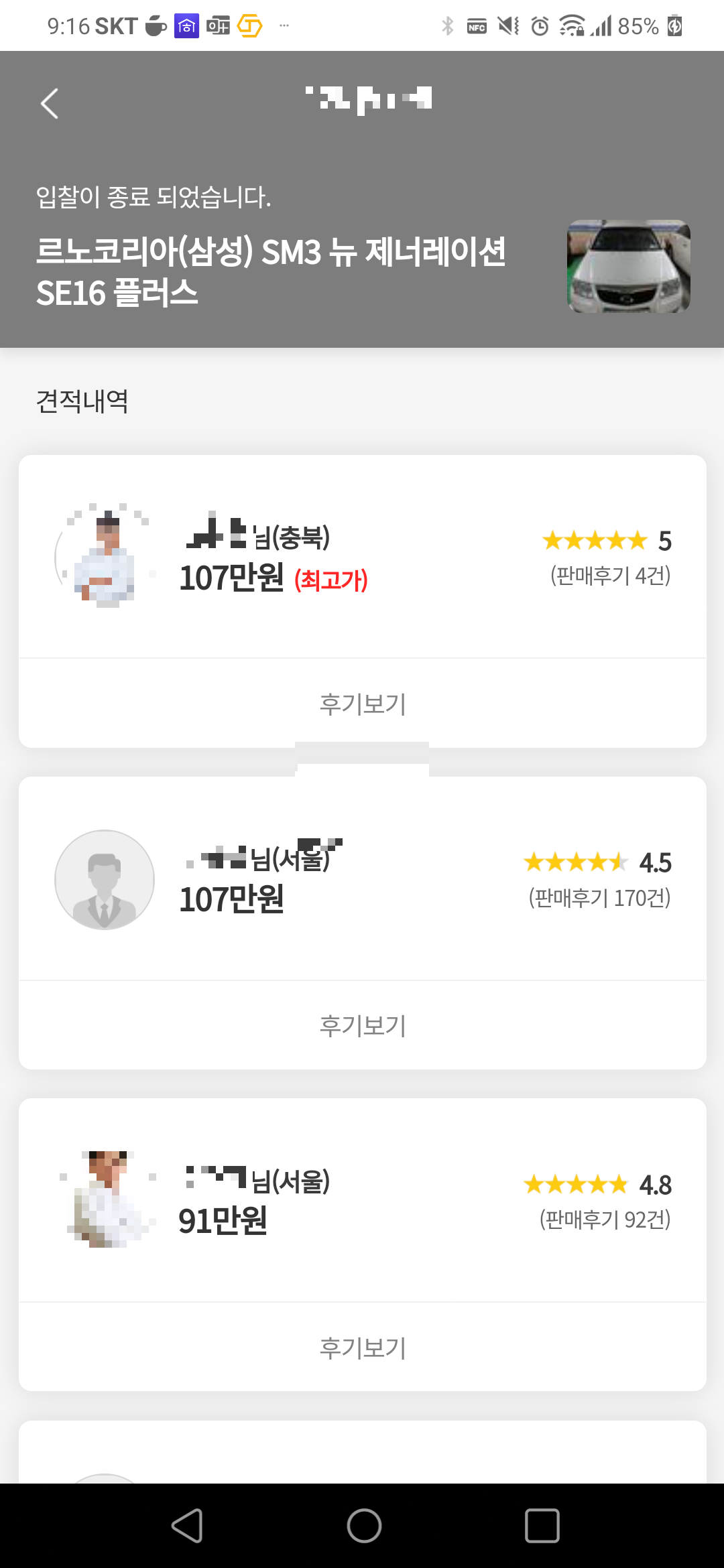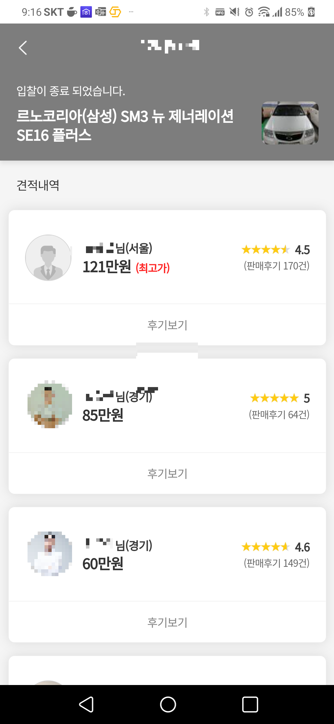 오래된 중고차를 팔기 위해 업체별로 비교를 했습니다.