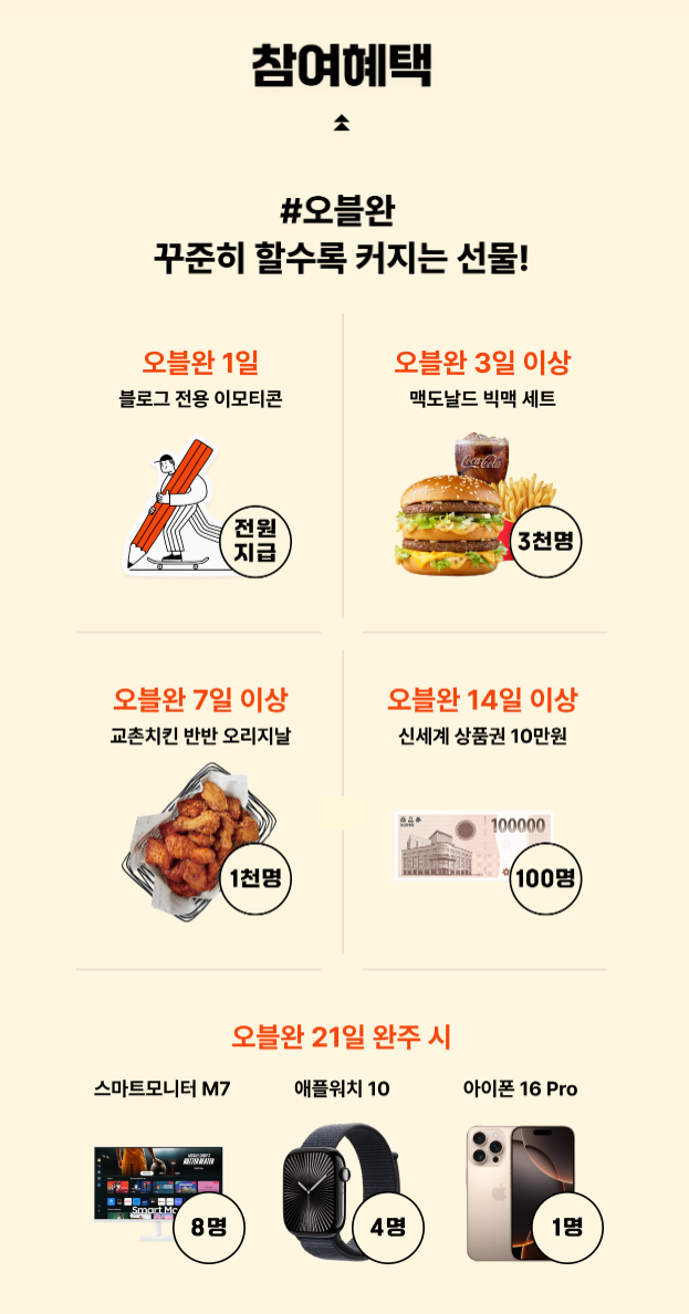 혜택이 좋습니다. 오블완 14일 이상 상품권 10만원.. 아니 오블완 21일 완주시 아이폰 16 pro 를 목표로 도전..ㅎㅎ