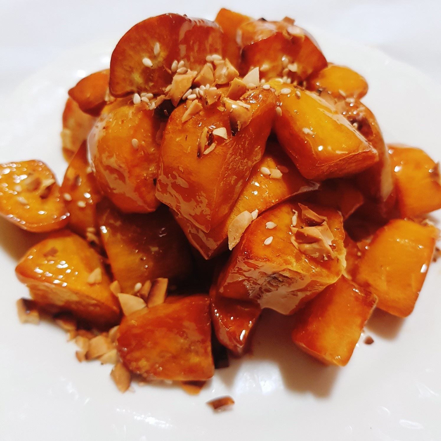 고구마맛탕이 완성되면, 접시에 예쁘게 담아줍니다. 마지막으로 검정깨를 뿌려주면 더욱 고소한 맛을 느낄 수 있습니다.